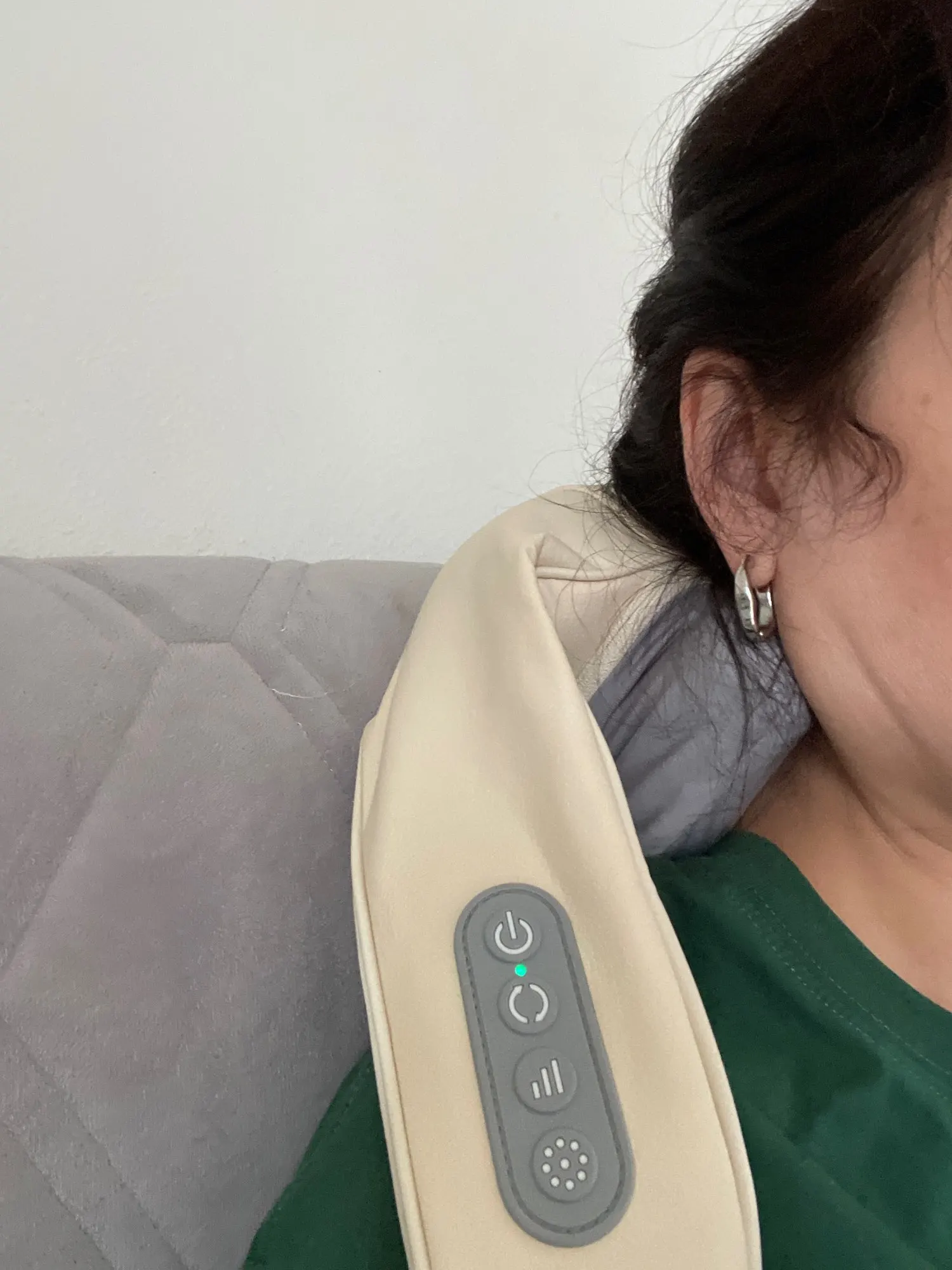 Portable neck and shoulder massager equipped with a 26W brushless motor. Designed for trapezius, neck, shoulders, and back, it features 3D kneading heads that simulate hand movements along with a gentle heating function for added comfort. Ideal for use at home, in the office, or while traveling.